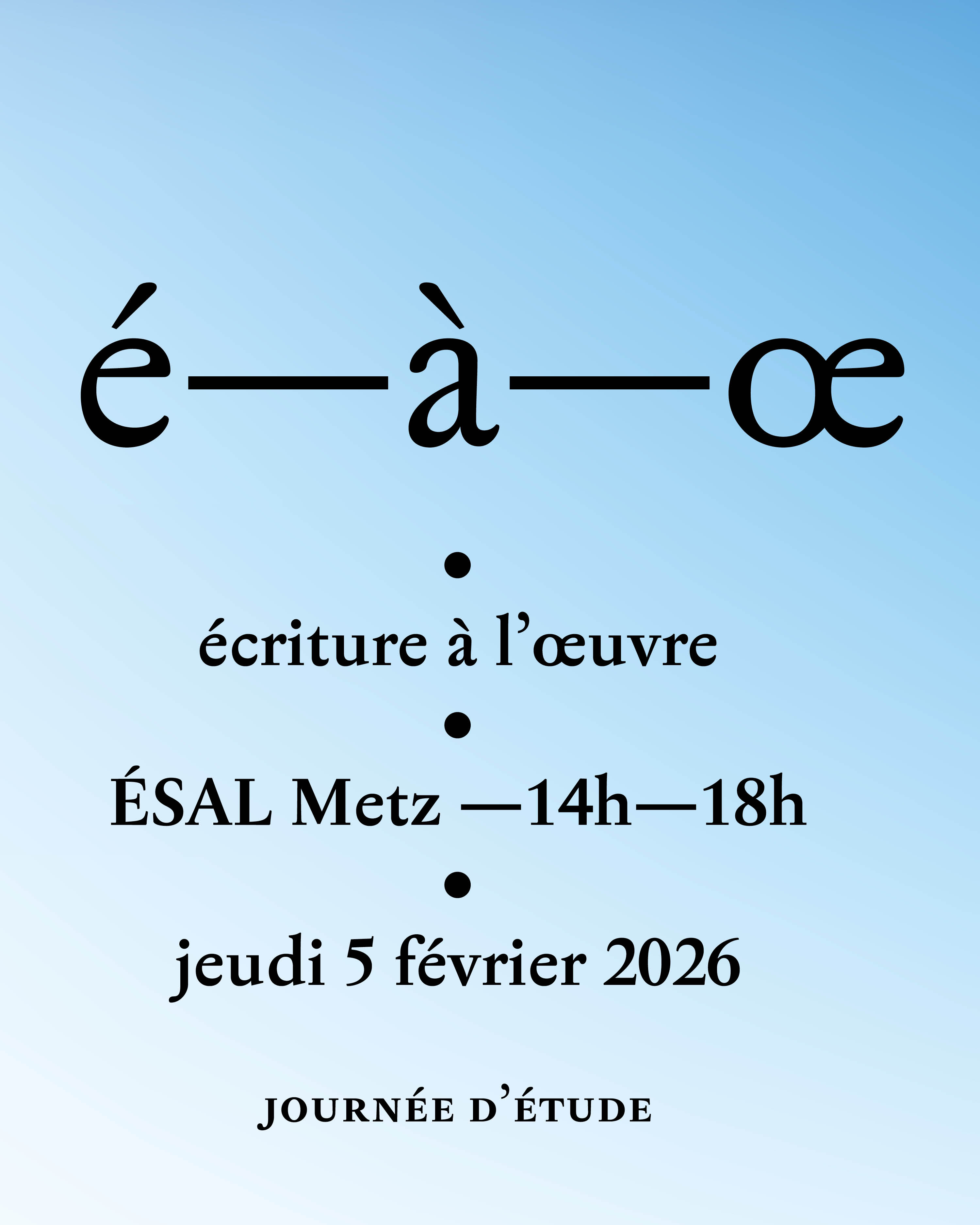 From 2 to 7 February 2026, ÉSAL is dedicating an entire week to contemporary writing practices, considered in all their forms: editorial, spatial, photographic, vocal and visual. The programme includes three workshops, a study day and an exhibition, inviting participants to discover writing as a true space for creation and experimentation (full programme available on the ÉSAL website).