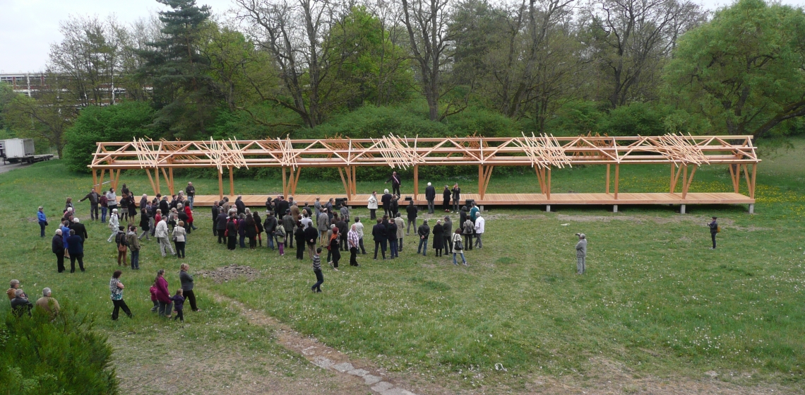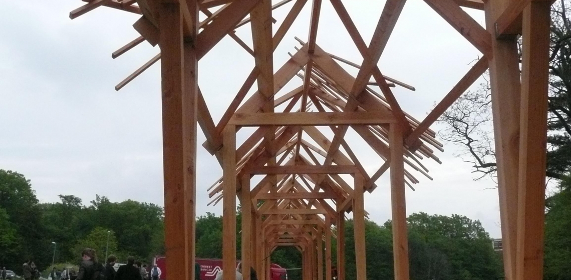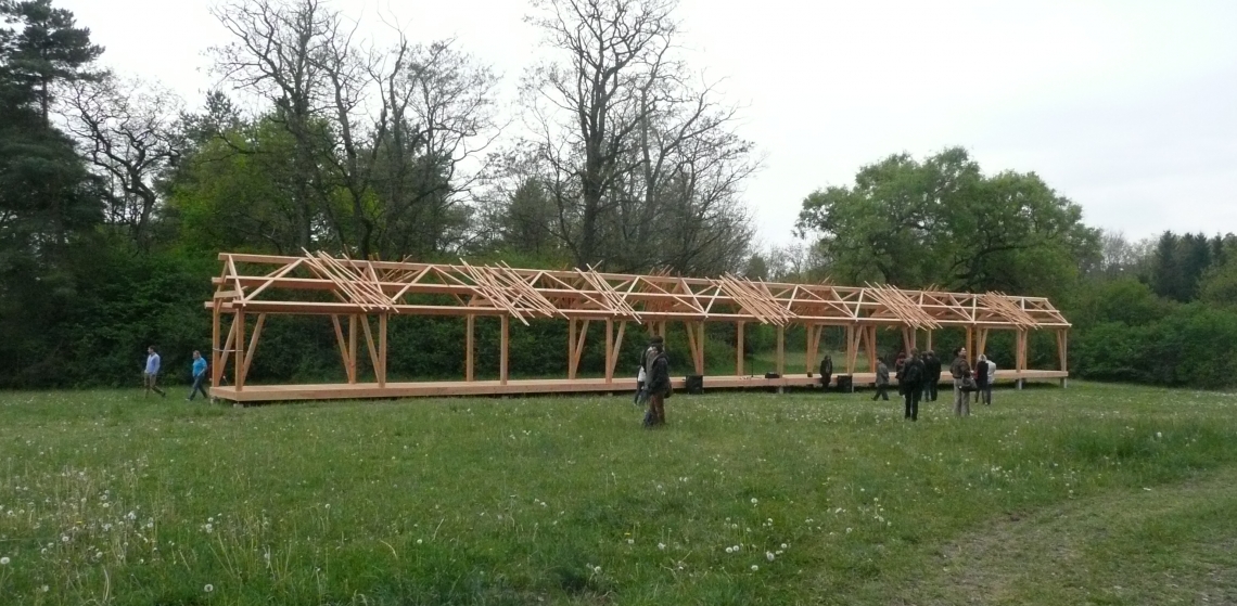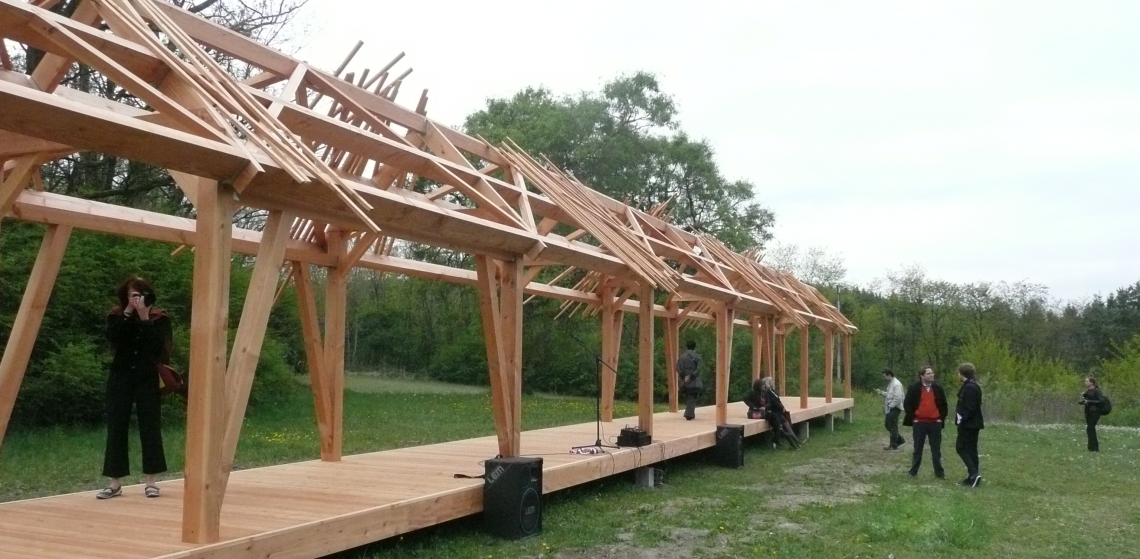 Lani Maestro envisage sa proposition comme l’« antithèse du lieu et du travail industriels » et comme un espace collectif. Limen – mot latin qui signifie « seuil », « passage d’un état vers un autre » – est le titre de cette sculpture. C’est une structure ajourée composée d’une longue plateforme surmontée d’une charpente de bois. La forme ouvre vers le paysage. Elle évoque le tunnel et le pont par le rythme régulier de ses travées et sa fonction de passage. L’oeuvre invite à la promenade et au repos comme « manière d’être avec soi-même », s’anime de notre présence et de celle des autres. Elle est installée entre l’ancienne cantine et le site de production, et conduit vers un pré en retrait.